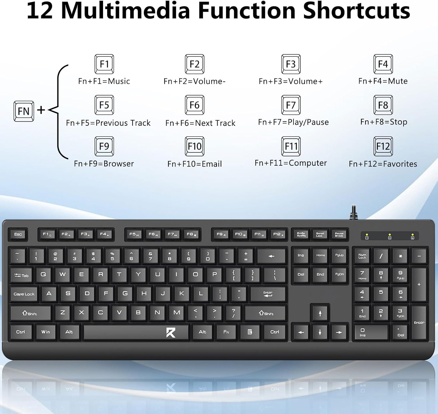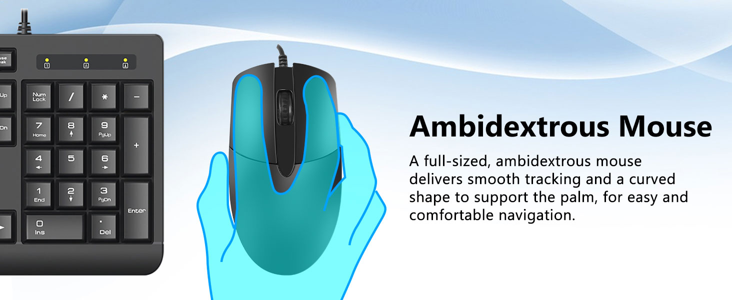 Black BC7543 Wired Keyboard and Mouse Combo sisältää normaalin täysikokoisen näppäimistöasettelun, mukaan lukien erillisen numeronäppäimistön. Tämä asettelu sopii erinomaisesti toimistotehtäviin, kuten tietojen syöttämiseen, taloustöihin ja laskentataulukoiden hallintaan.