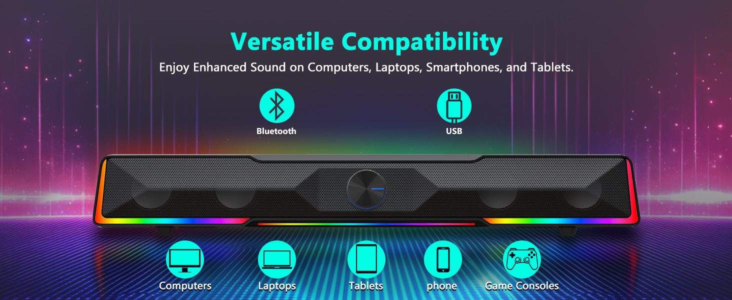 Yhteensopivat laitteet Musta GS516 Bluetooth/USB-langallinen Soundbar-äänenvoimakkuuden säädintietokonekaiutin on suunniteltu toimimaan useiden laitteiden kanssa. Yhteensopivia laitteita ovat yleensä: