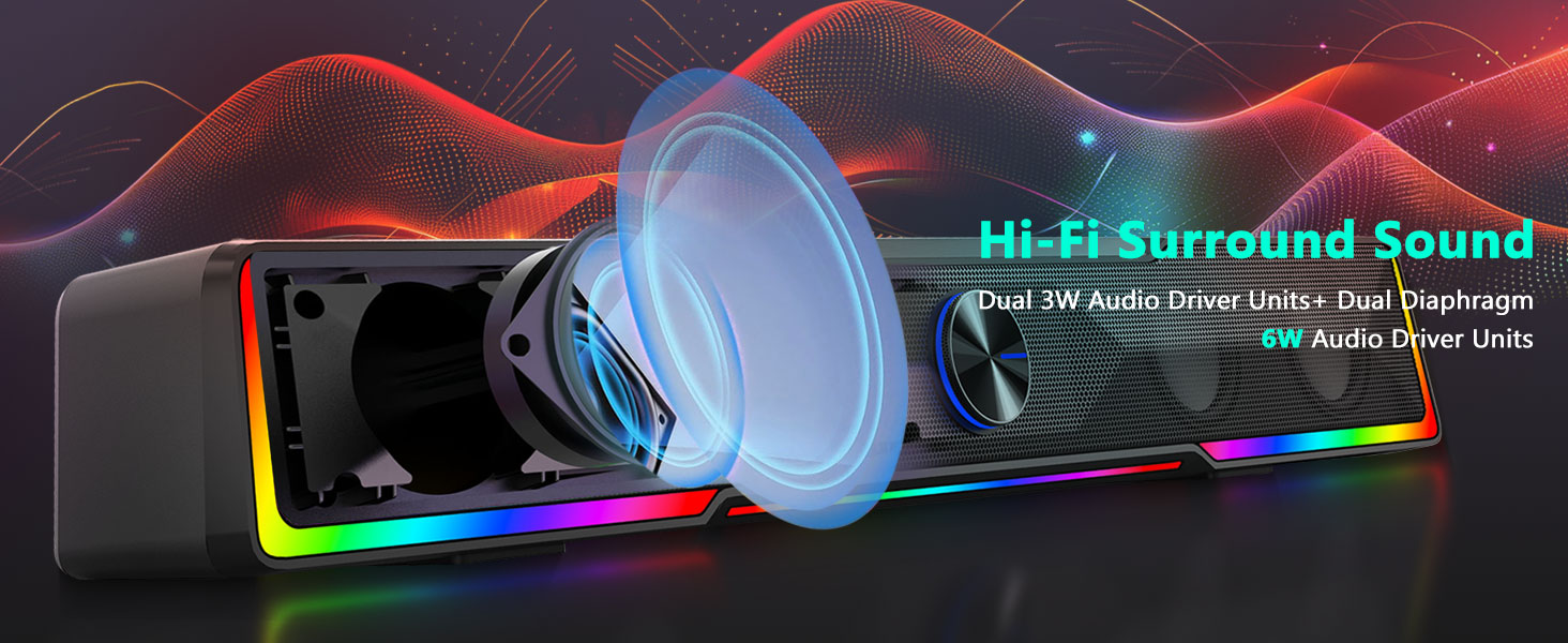 Laadukas stereoääni Tehokkailla stereoajureilla varustettu Black GS516 Bluetooth/USB Wired Connection Soundbar Volume Nupu -tietokonekaiutin tarjoaa tasapainoisen äänen selkeällä laululla, yksityiskohtaisella keskialueella ja parannetulla bassovasteella. Kaiutin on suunniteltu tuottamaan mukaansatempaavaa ääntä monentyyppiselle sisällölle, mukaan lukien elokuvat, pelit, podcastit ja musiikki.