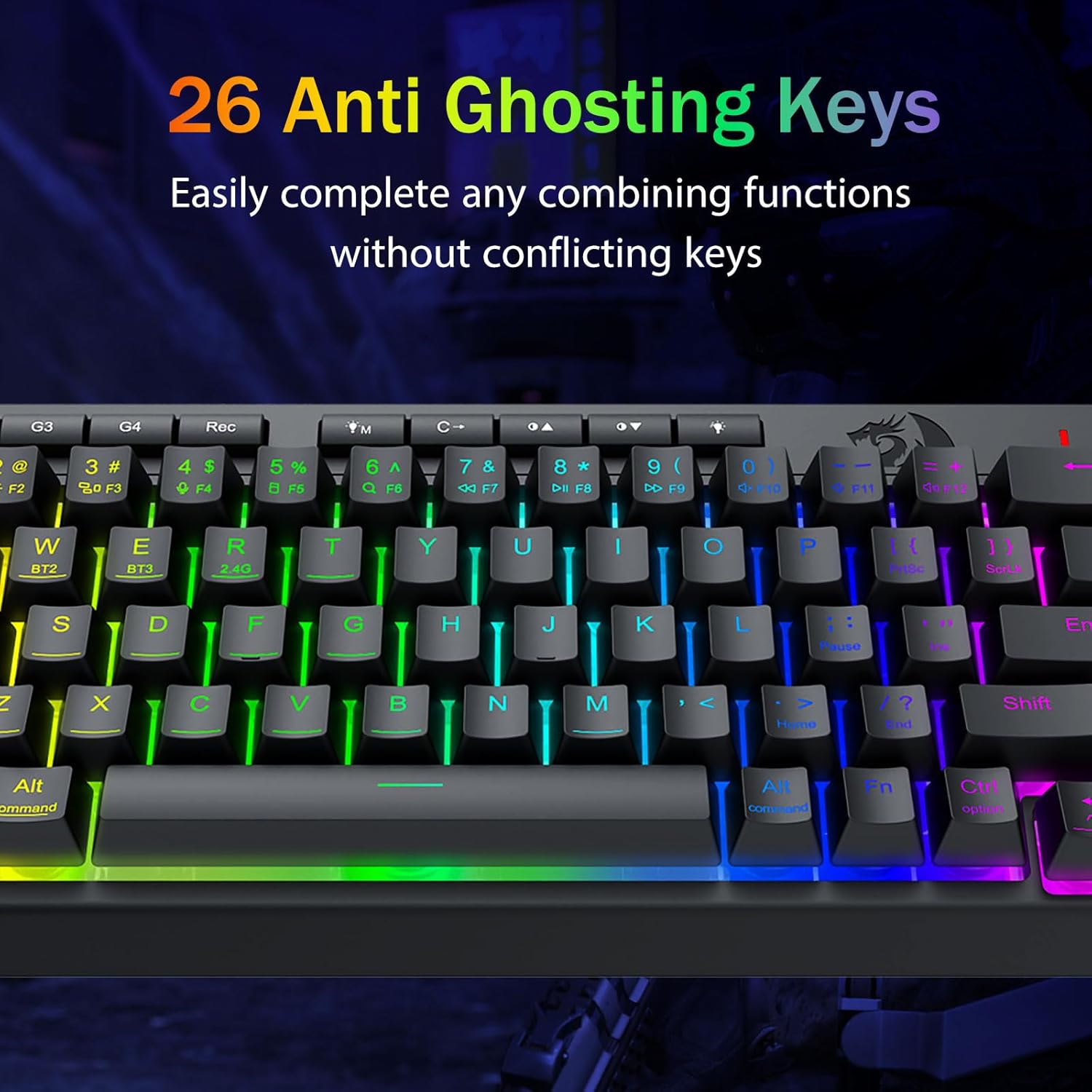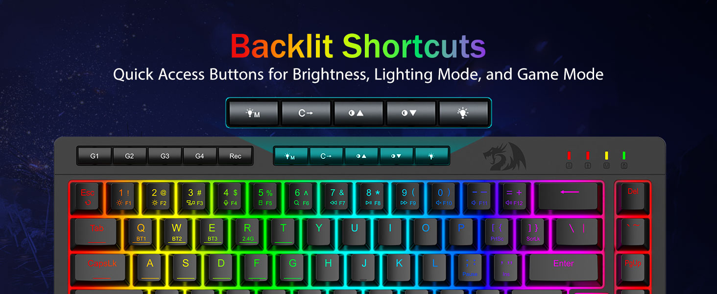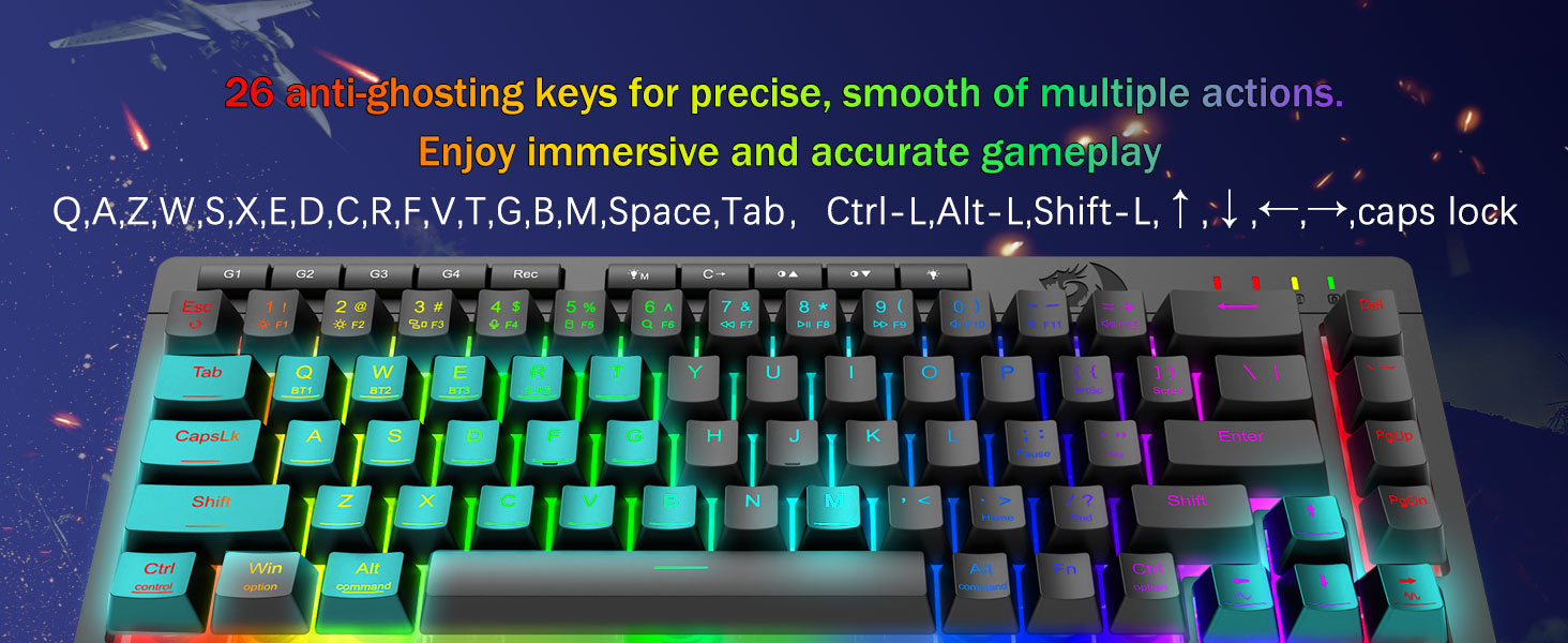 Ammattitason pelisuorituskyky ja taustavalaistut säätimet -Mukana haamukuvia estävät näppäimet (näppäimet, joissa on alaviiva), jotka mahdollistavat 26 näppäimen samanaikaisen toiminnan, mikä takaa nopeat ja tarkat pelivasteet haluamallasi tavalla. Pikakäyttöpainikkeet kirkkautta, valaistustilaa ja pelitilaa varten säätävät kirkkautta, valaistusprofiileja ja otat pelitilan käyttöön nopeasti yhdellä napin painalluksella.