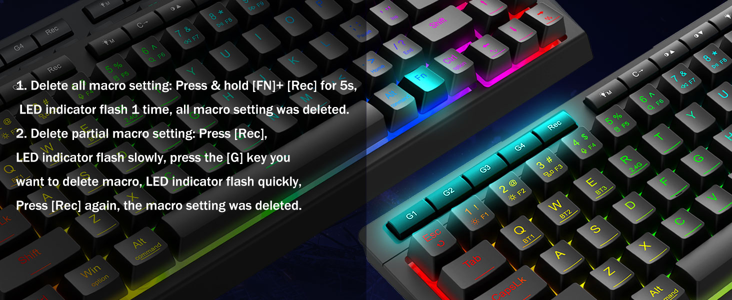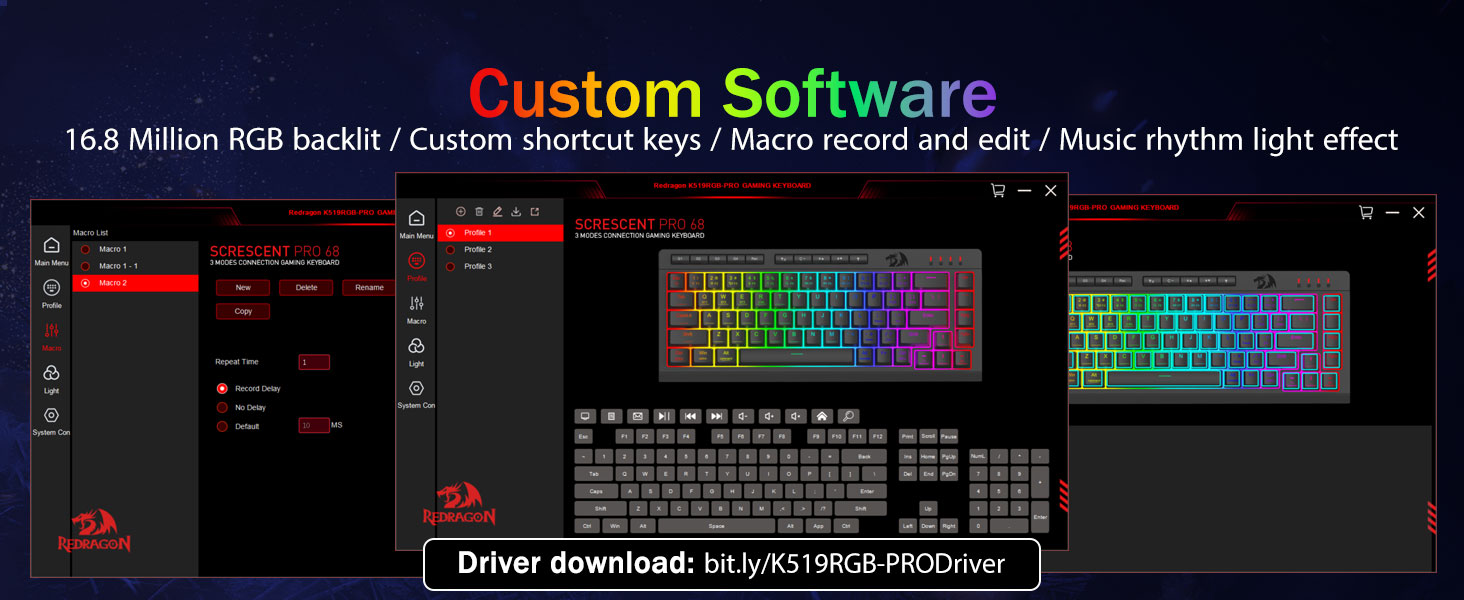 Muokattavat makrot, vaivaton ohjaus -Ohjelmoi 4 sisäistä makronäppäintä (G1-G4) välittömästi – ohjelmistoa ei tarvita. Tallenna monimutkaisia komboja pelaamiseen, tuottavuuden pikakuvakkeita tai mediakomentoja. Määritä työnkulkusi uudelleen sekunneissa. Voit myös käyttää ohjelmistoja toimintojen mukauttamiseen, makrojen luomiseen, RGB-valojen säätämiseen ja pikavalintojen asettamiseen. Ohjelmistolinkki: bit.ly/K524RGB-PRODriver