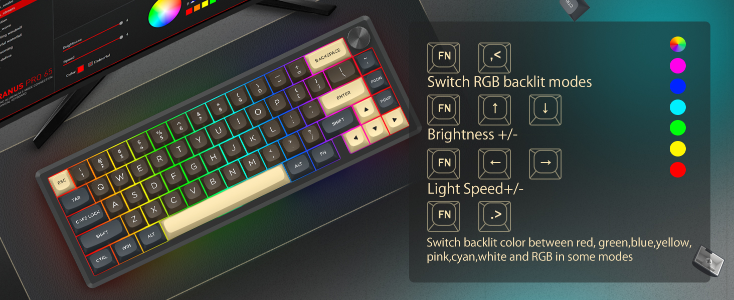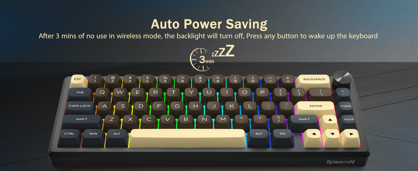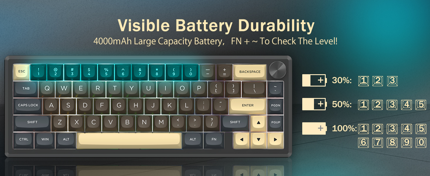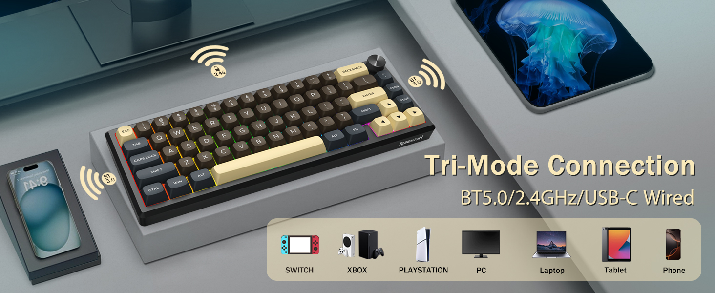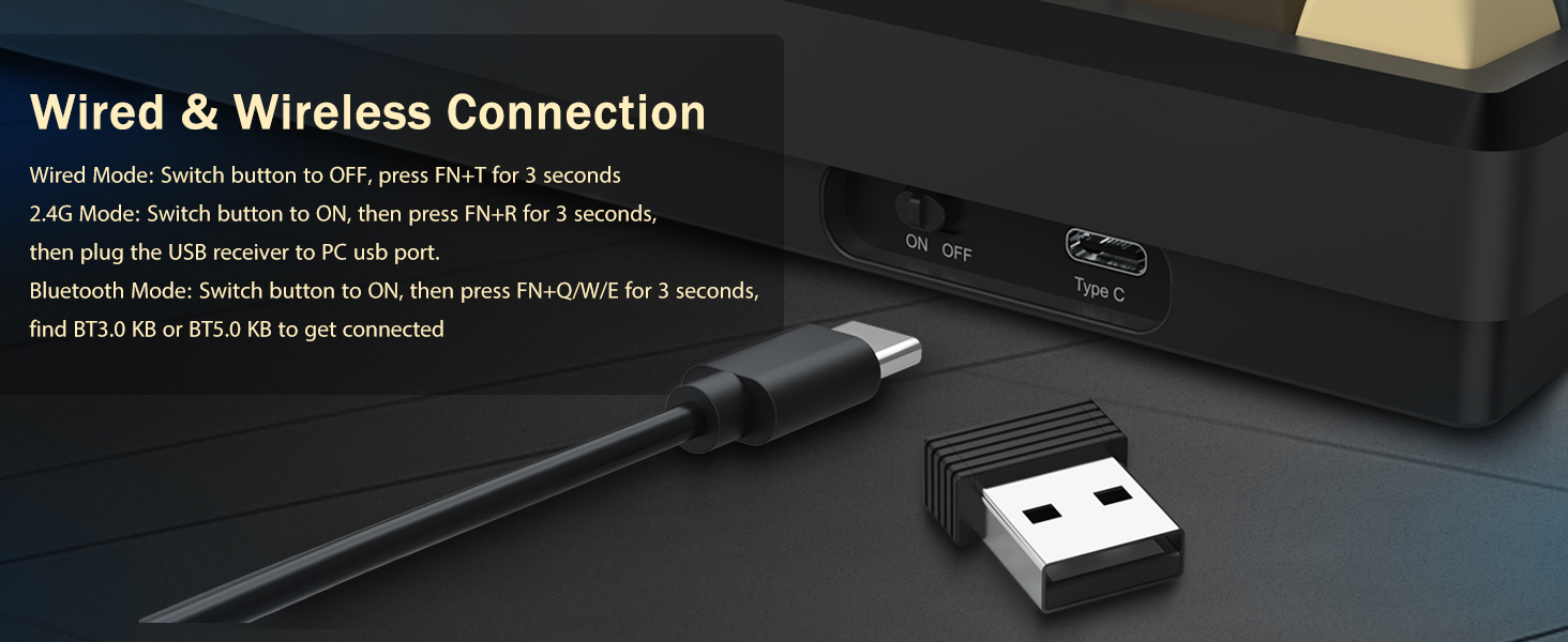 Näppäimistö tukee langatonta yhteyttä ja langallista USB-liitäntää vakaan suorituskyvyn takaamiseksi. Käyttäjät voivat vaihtaa tilojen välillä asetustensa mukaan.
