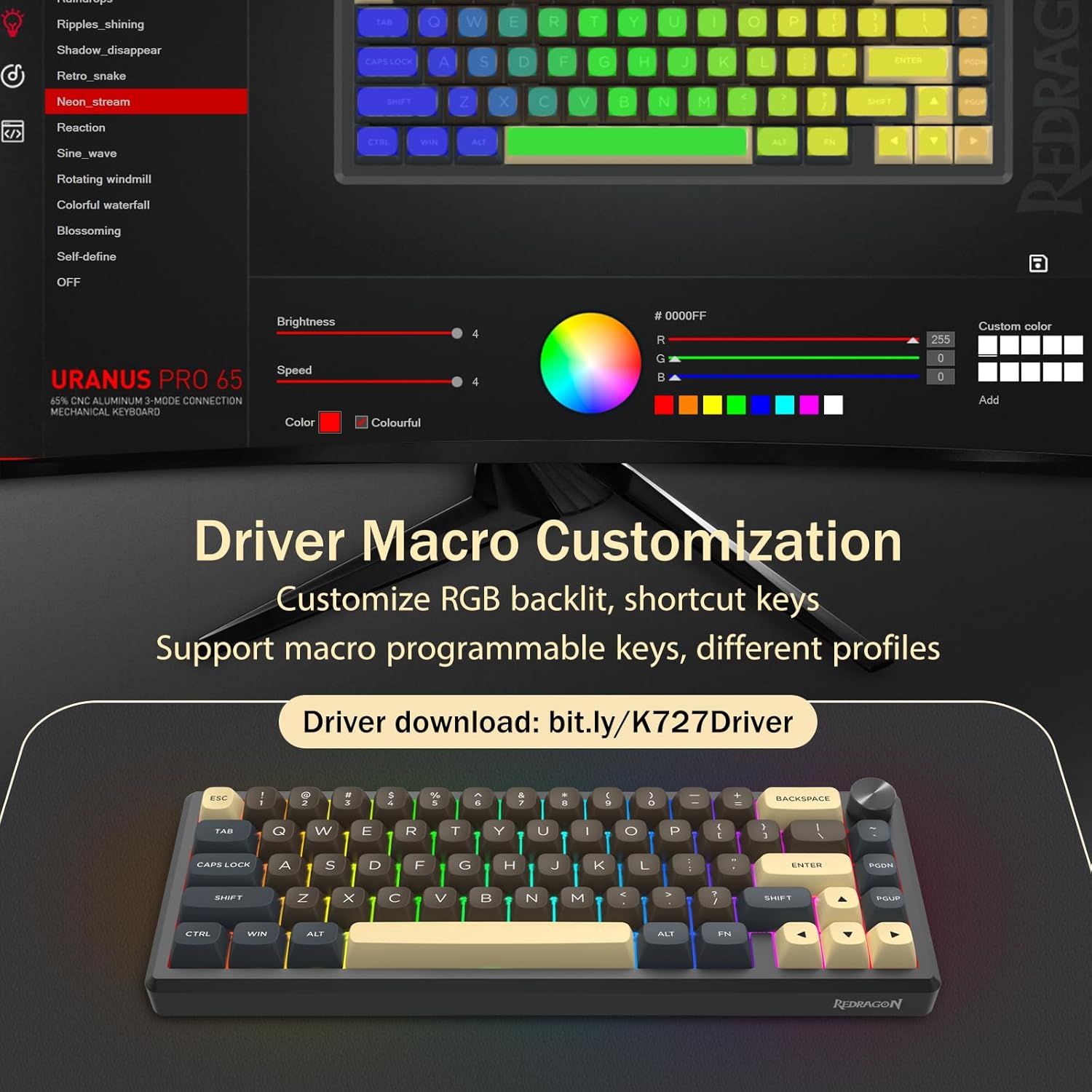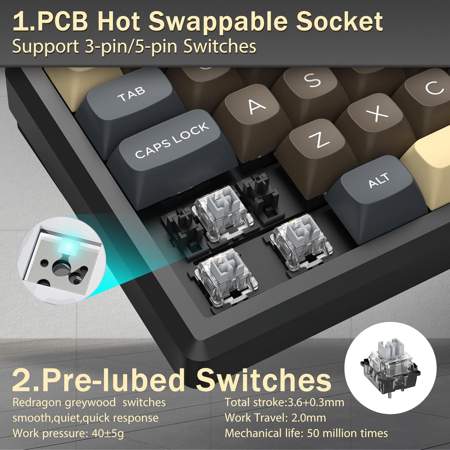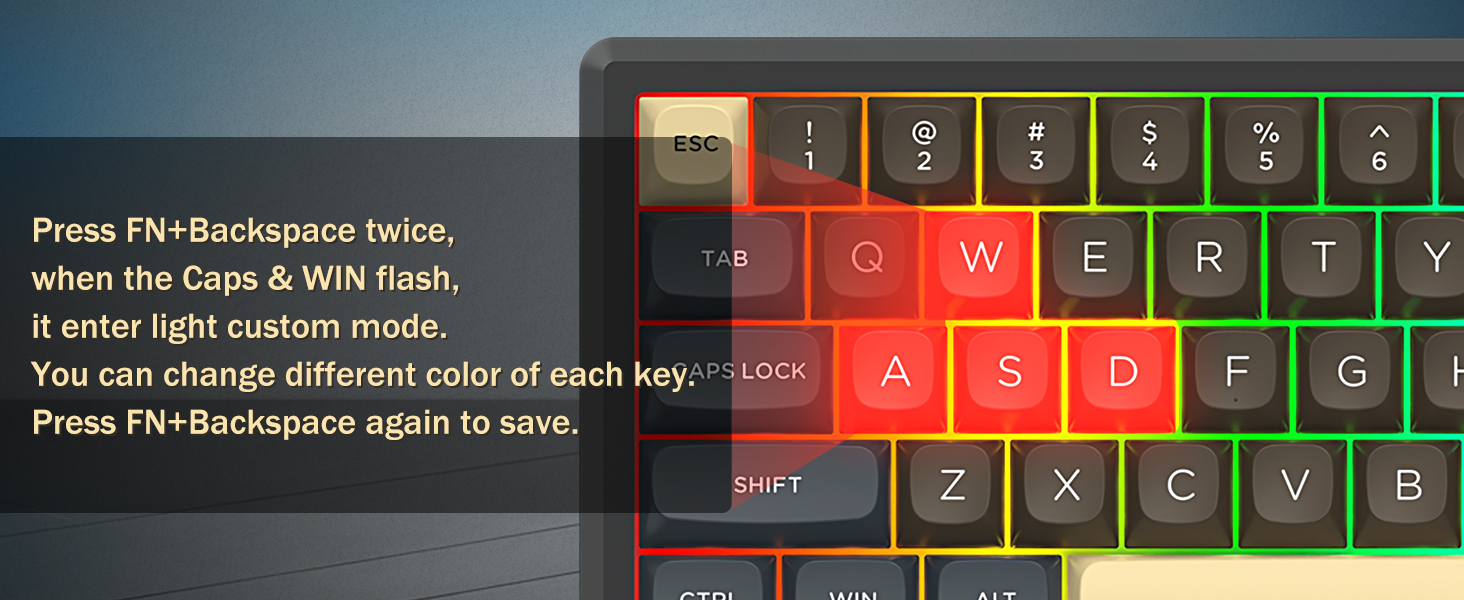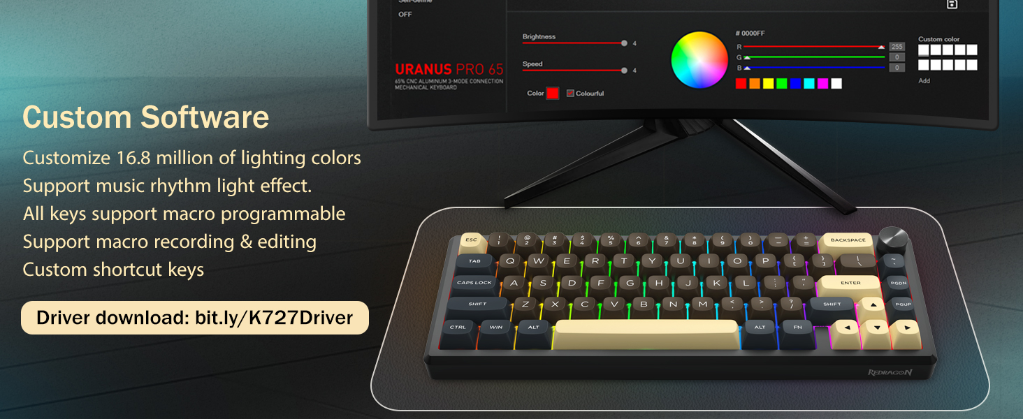 Näppäimistö tukee langatonta yhteyttä ja langallista USB-liitäntää vakaan suorituskyvyn takaamiseksi. Käyttäjät voivat vaihtaa tilojen välillä asetustensa mukaan.