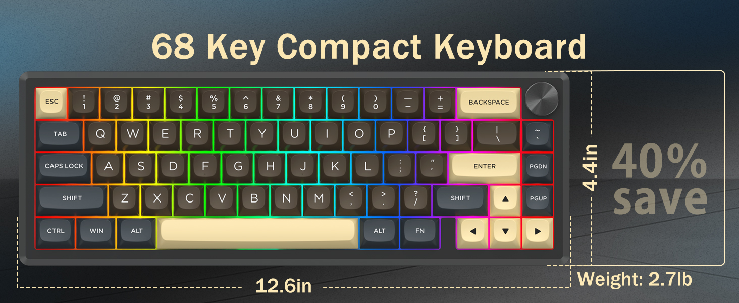 V: 60 %:n asettelu pienentää näppäimistön kokoa poistamalla tarpeettomat näppäimet. Tämä tarjoaa enemmän pöytätilaa ja parantaa siirrettävyyttä, mutta silti mahdollistaa pääsyn kaikkiin toimintoihin näppäinyhdistelmien avulla.