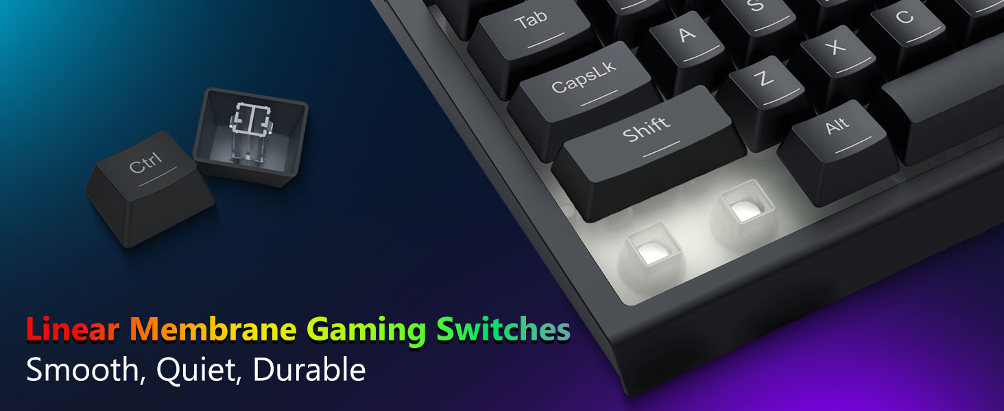 Näppäimet on suunniteltu antamaan tasainen palaute ja tasapainoinen käyttö. Tämä varmistaa tarkan kirjoittamisen ja luotettavan syötteen pelaamisen tai toimistokäytön aikana.
