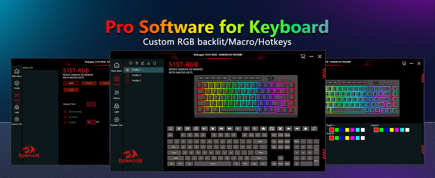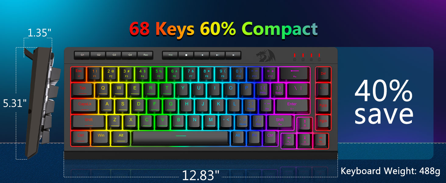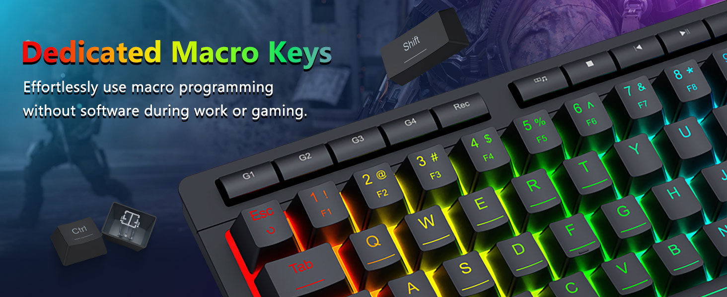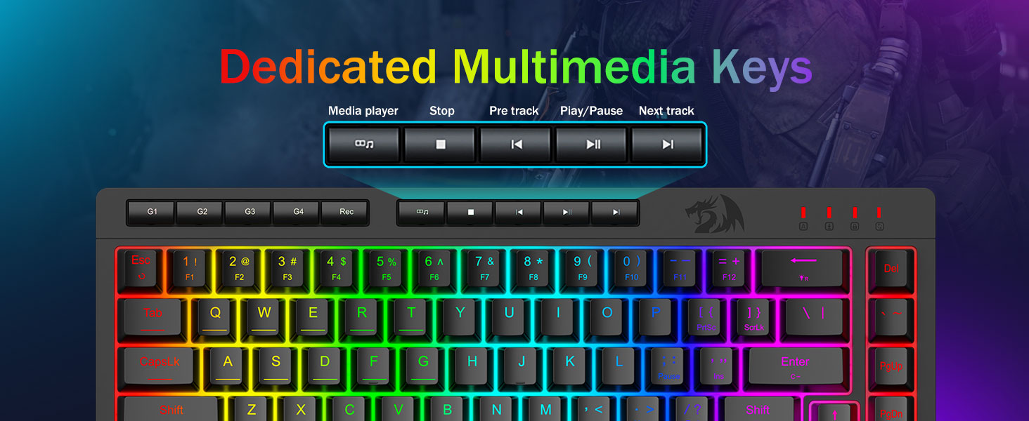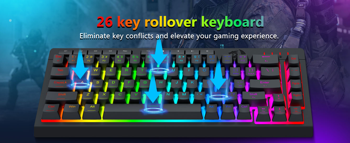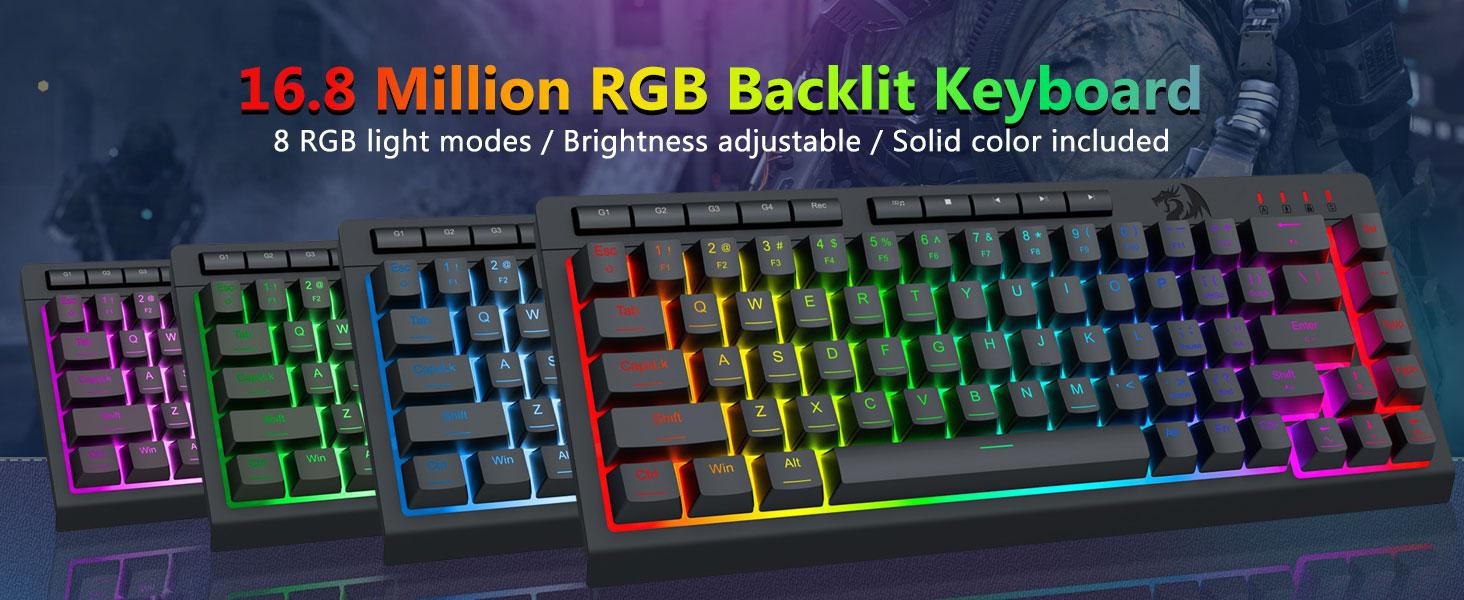 Integroitu RGB-valaistus parantaa avainten näkyvyyttä hämärissä ympäristöissä. Valaistusjärjestelmä tarjoaa useita tiloja, joiden avulla käyttäjät voivat säätää kirkkautta ja tehosteita mieltymystensä mukaan.