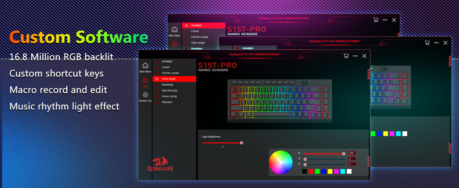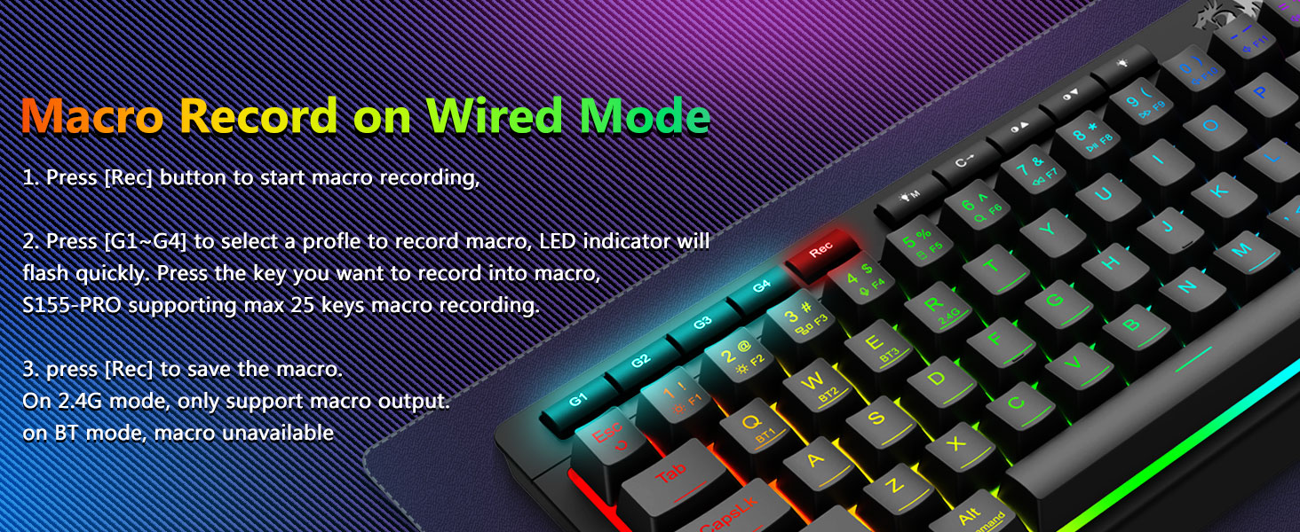 Mukautettavat makrot, taustavalaistut säätimet- Ohjelmoi 4 sisäistä makronäppäintä (G1-G4) välittömästi – ohjelmistoa ei tarvita. Tallenna monimutkaisia komboja pelaamiseen, tuottavuuden pikakuvakkeita tai mediakomentoja. Määritä työnkulkusi uudelleen sekunneissa. Voit myös käyttää ohjelmistoja toimintojen mukauttamiseen, makrojen luomiseen, RGB-valojen säätämiseen ja pikavalintojen asettamiseen. Mukana haamukuvia estävät näppäimet (näppäimet, joissa on alaviiva), jotka mahdollistavat 26 näppäimen samanaikaisen toiminnan, mikä takaa nopeat ja tarkat pelivasteet haluamallasi tavalla. Pikakäyttöpainikkeet kirkkautta, valaistustilaa ja pelitilaa varten säätävät kirkkautta, valaistusprofiileja ja otat pelitilan käyttöön nopeasti yhdellä painikkeen painalluksella.