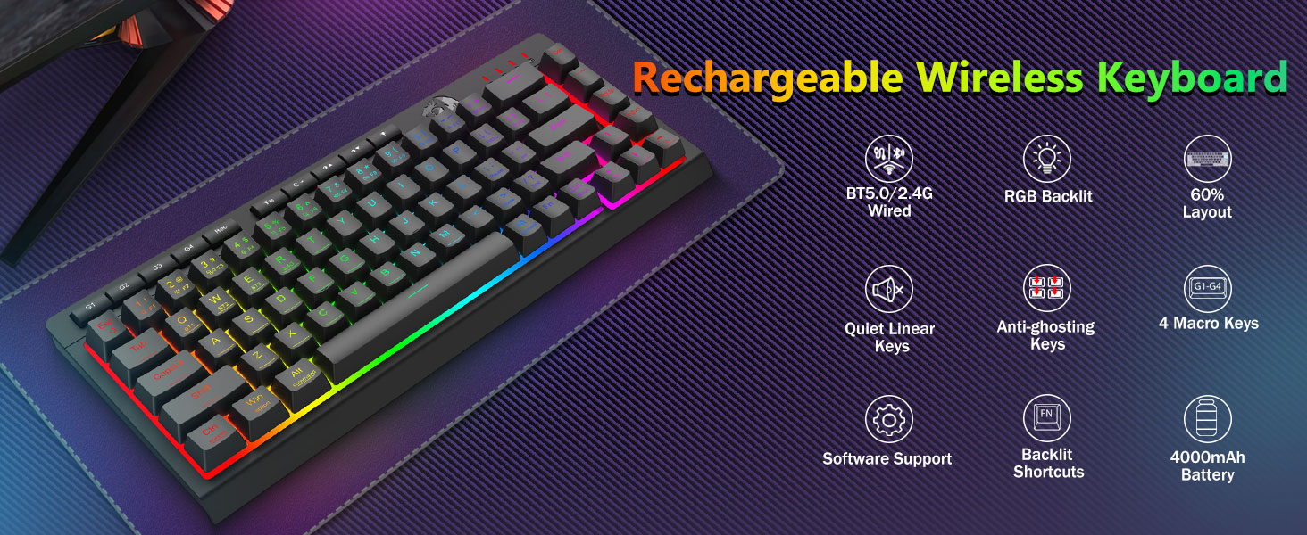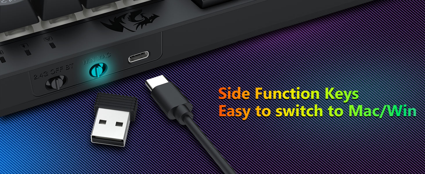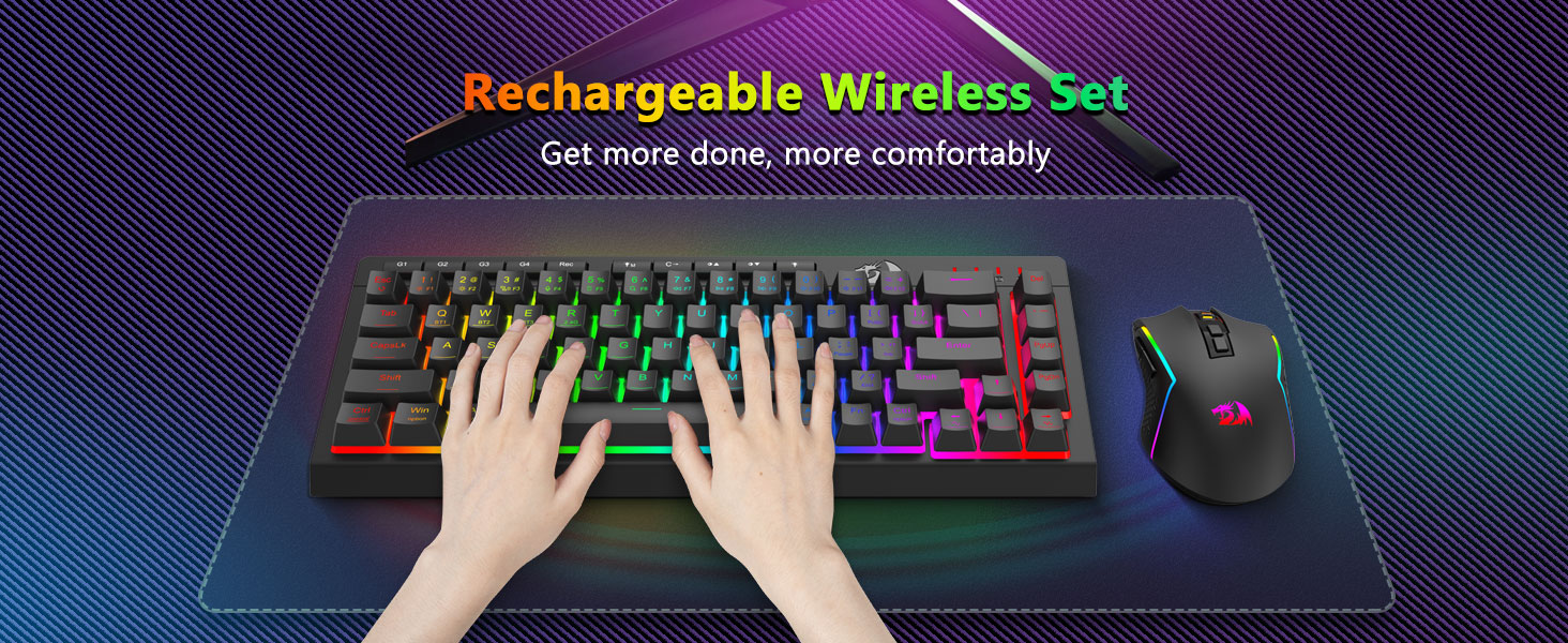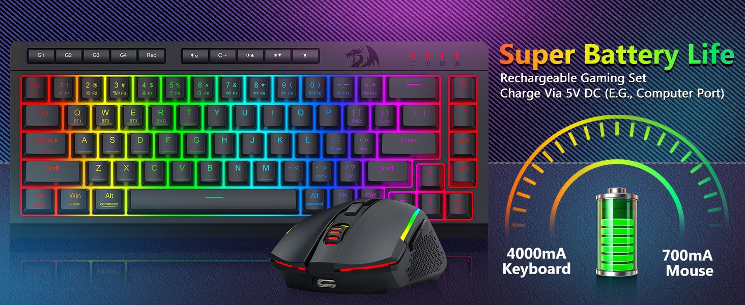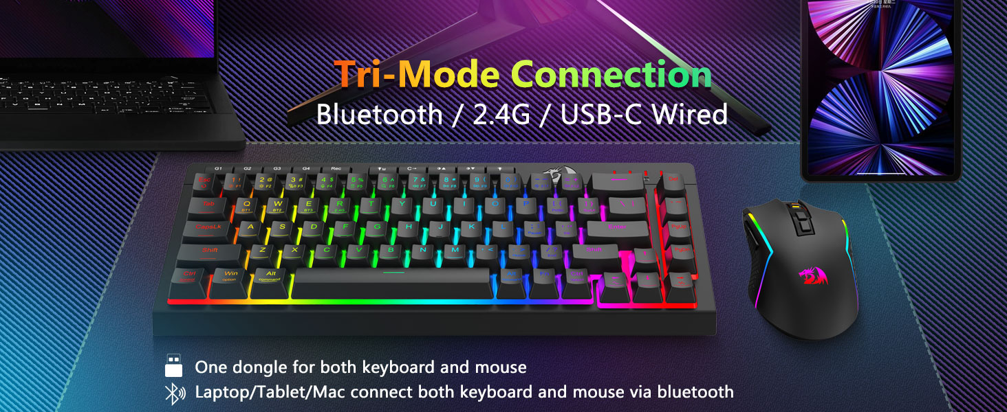 Tri-Mode monikäyttöinen näppäimistö ja hiiri- Vaihda saumattomasti Bluetooth 5.0, 2,4 GHz langattoman tai USB-C langallisen tilan välillä yhdistämällä jopa eri laitteisiin (PC, Mac, tabletit, puhelimet, PS/XBOX). Vaihda laitteita vaivattomasti pikanäppäimillä tai sivupainikkeella – täydellinen hybridityö-/peliasennuksiin. Pysy vireillä viikkoja 4 000 mAh:n akkunäppäimistön ja 700 mAh:n akkuhiiren avulla (yli 30 päivän valmiustila, 50 tunnin RGB-käyttöaika).