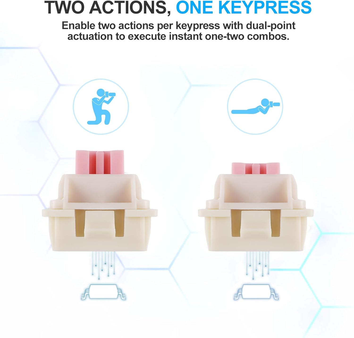 V: Pikaliipaisu mahdollistaa näppäimien nollaamisen välittömästi vapauttamisen jälkeen, mikä mahdollistaa nopeamman toistuvan syötteen. Tämä parantaa reagointikykyä peleissä, jotka vaativat nopeita reaktioita ja tarkkaa ajoitusta.