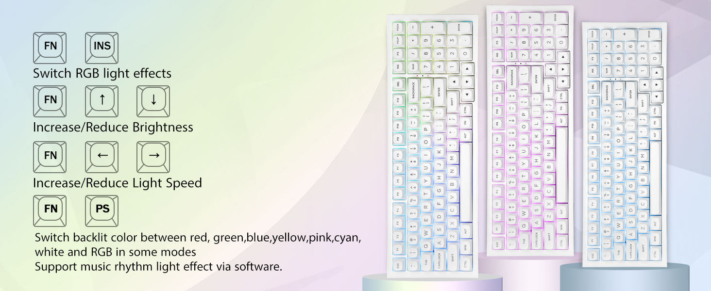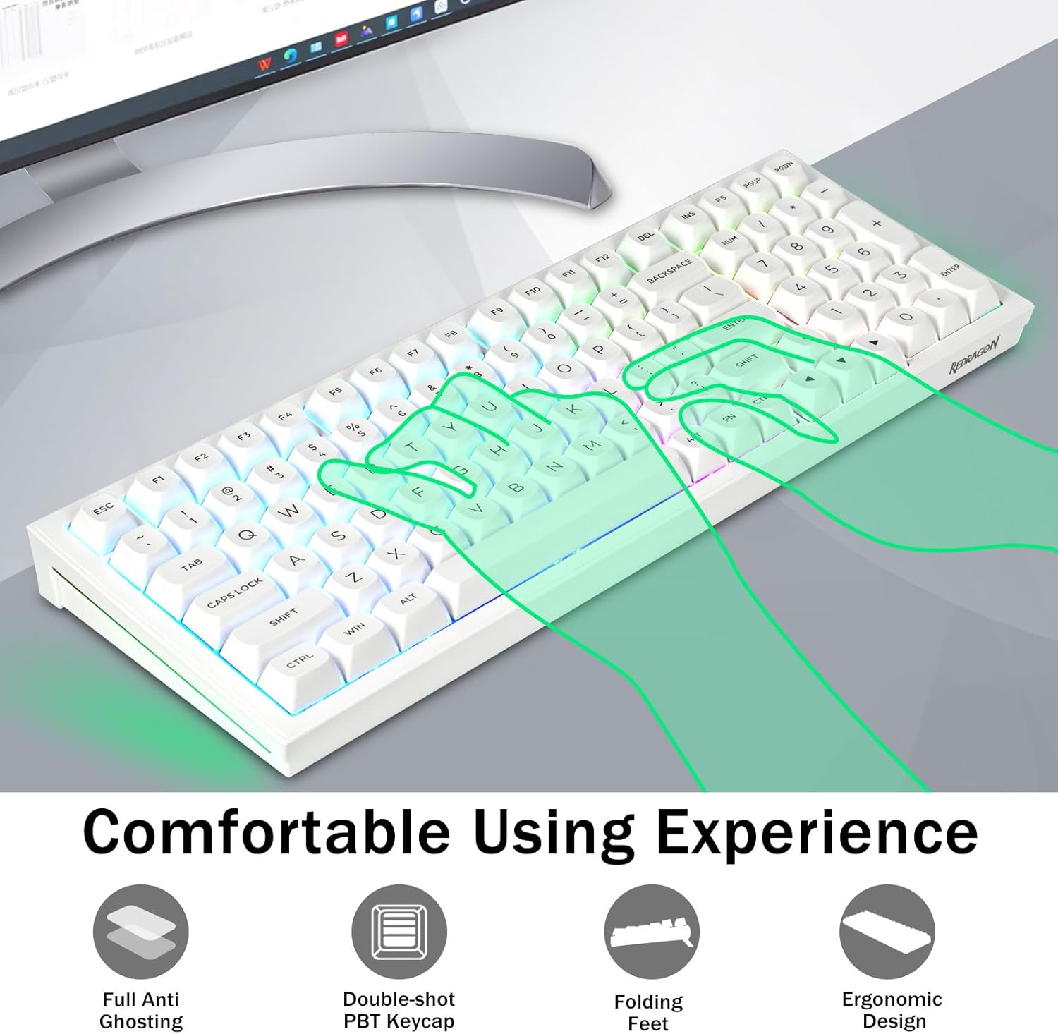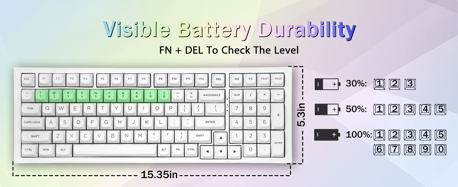 PBT-näppäimet ja 4000 mAh akku:99 näppäintä 96 % asettelu kompakti näppäimistö voi säästää enemmän työpöytätilaa säilyttäen samalla tarvittavat nuolinäppäimet ja numeroalueen pelejä ja työtä varten. Ladattavassa näppäimistössä on sisäänrakennettu 4000 mAh:n suuri kapasiteetti akku, joka tarjoaa enemmän tehoa ja pidemmän akun käyttöiän. Kaksinkertaiset PBT-näppäimet, jotka on valmistettu kahdesta väriaineesta, jotka on valettu toisiinsa, saavat näppäimistön merkit säilyttämään eloisuuden ja kylläisyyden, selkeitä eivätkä haalistu.