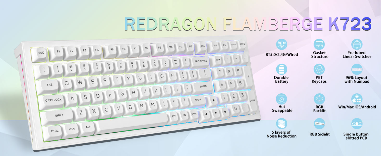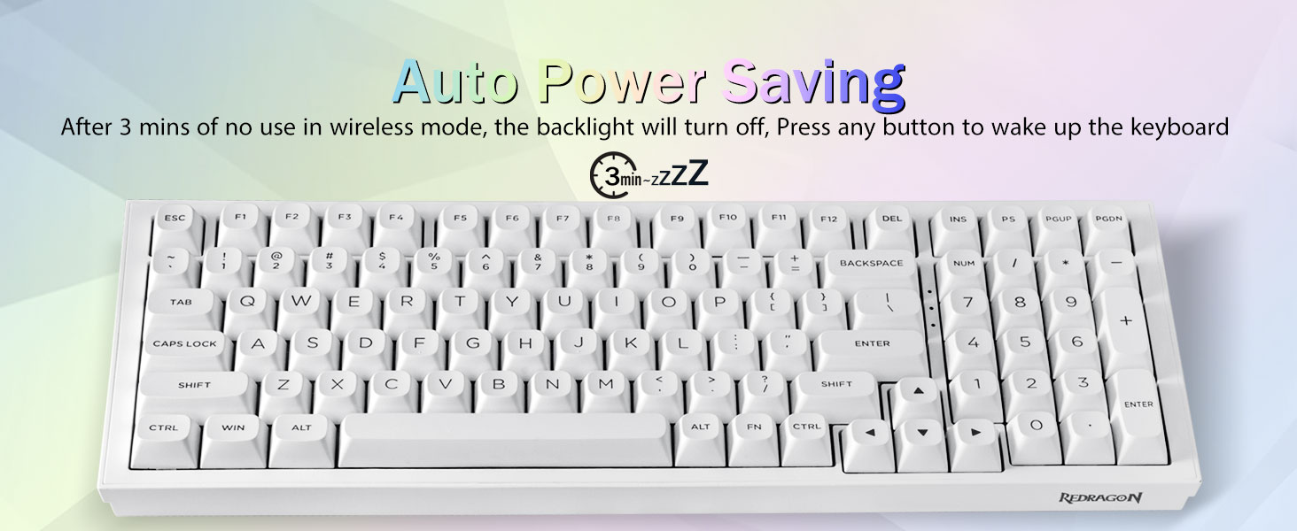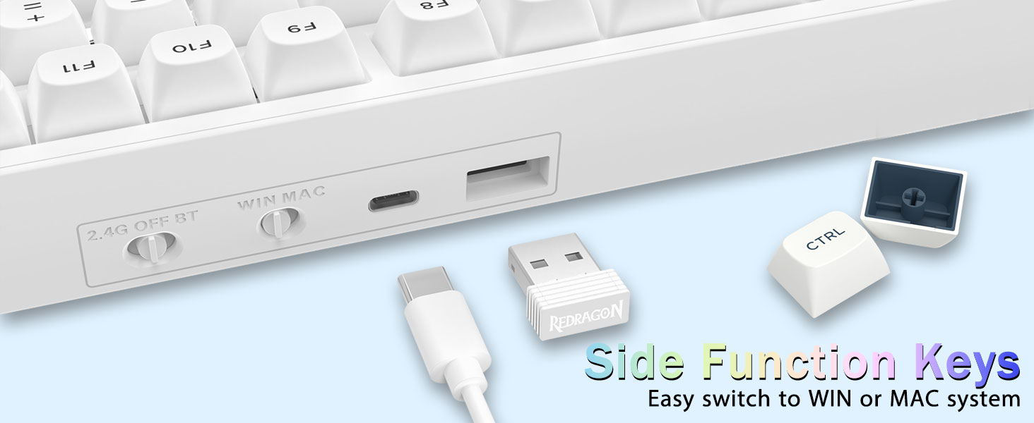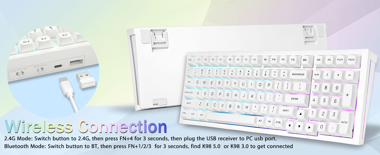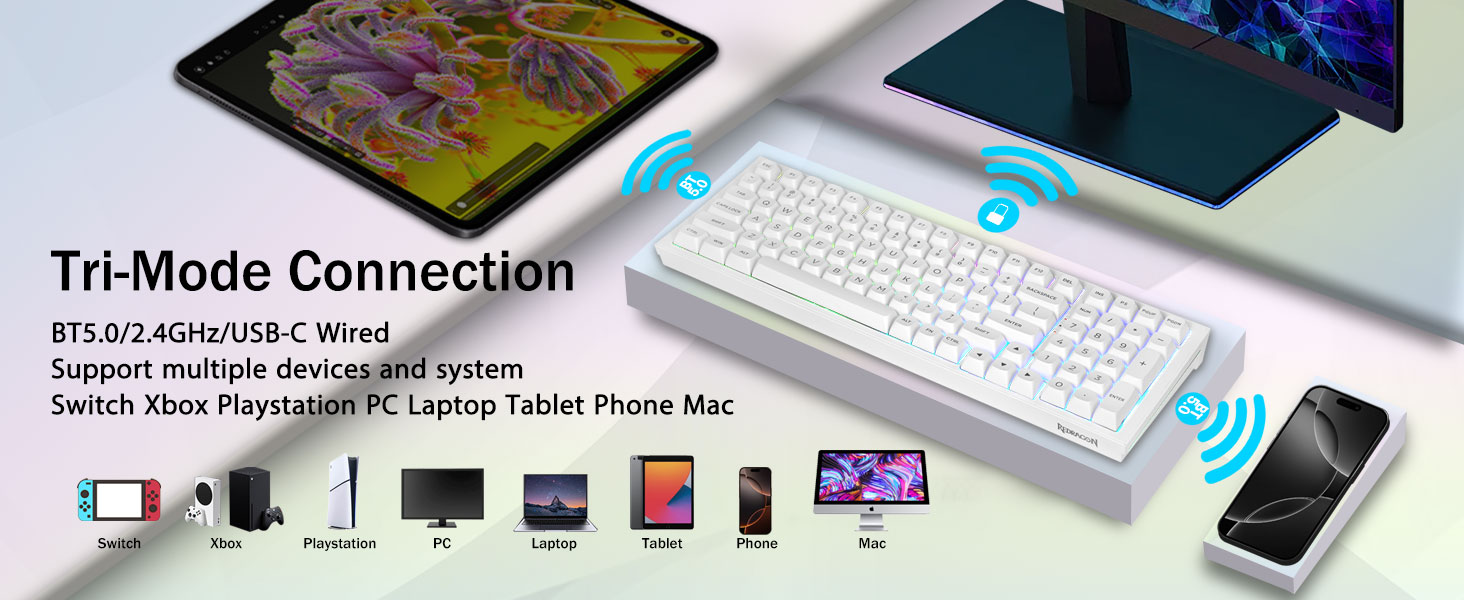 Usean laitteen yhteys:Langaton mekaaninen Redragon K723 -näppäimistö tarjoaa kolme yhteystapaa, mukaan lukien BT5.0, 2,4 GHz:n langaton tila ja USB-langallinen tila. Se voidaan yhdistää jopa viiteen laitteeseen samanaikaisesti ja vaihtaa niiden välillä helposti FN- ja näppäinyhdistelmänäppäimillä. Näppäimistöyhteydelläsi ei ole rajoituksia työn, pelaamisen ja opiskelun tarpeisiin.