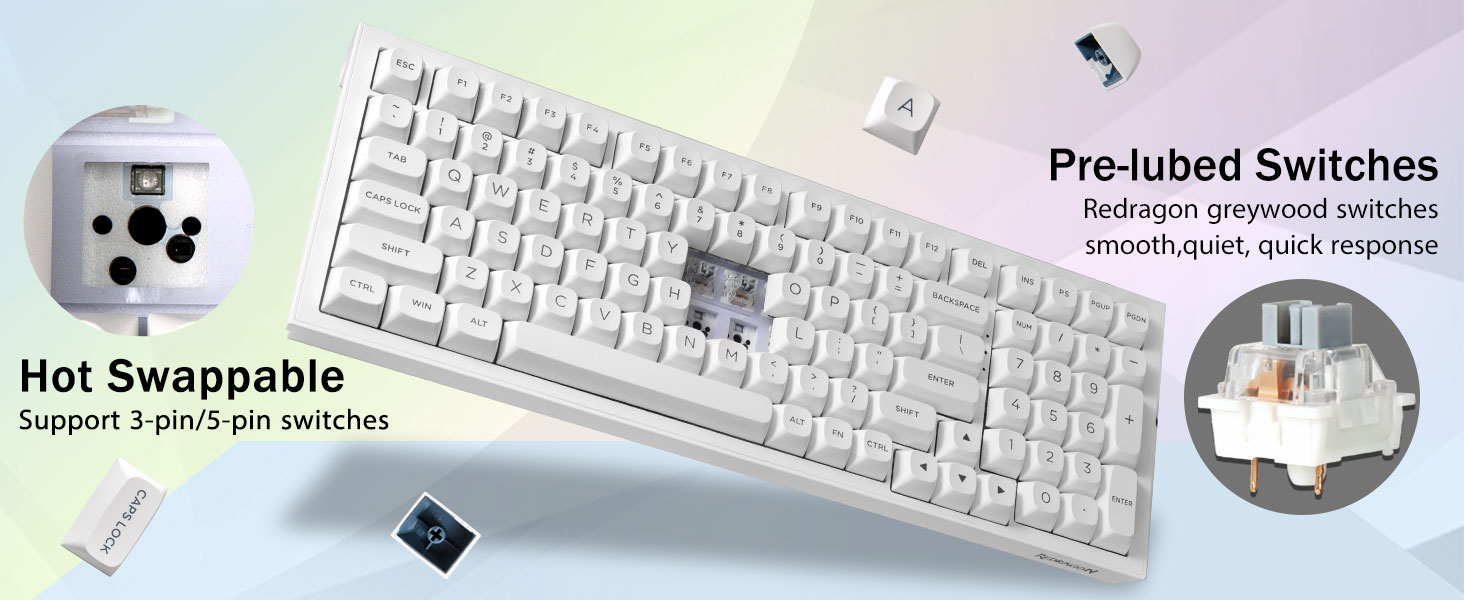Hot-swap mukautettu näppäimistö:Kytkimet ja näppäinsuojukset voidaan vaihtaa vapaasti (näppäinsuojus/kytkimen vedin sisältyvät pakkaukseen). Tämä mukautettava näppäimistö hot-swap-piirilevyllä mahdollistaa 3-nastaisen/5-nastaisen kytkimien vaihtamisen helposti ilman juotosongelmia. Mekaaniset K723-näppäimistöt, jotka on varustettu esivoidetuilla lineaarisilla kytkimillä, tuovat pehmeän kirjoitustuntuman ja miellyttävän kirjoitusäänen, tarjoavat nopean vastauksen jännittävään peliin