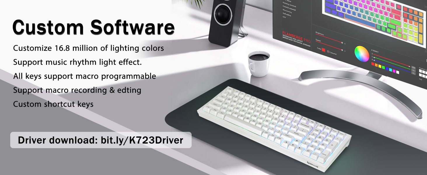 Mekaaninen pelinäppäimistö:K723 on ensiluokkainen mekaaninen näppäimistö sekä työhön että peliin. 16 RGB-valotehoste lisää pelihuoneeseen upeaa tunnelmaa. Näppäimet tukevat makrojen mukauttamista, mikä mahdollistaa makrojen tallentamisen ja muokkaamisen, mukauttaa näppäintoimintoa ja 16,8 miljoonaa valoväriä sekä tukee viileitä musiikin rytmivalotehosteita ohjaimen kanssa. N-näppäimen rollover, näppäimistö voi vastata useisiin näppäinpainalluksiin samanaikaisesti, mikä on hyödyllistä erittäin jännittävissä reaaliaikaisissa peleissä.