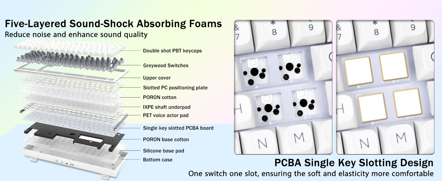 Tiivisteen rakenne ja piirilevyn yhden avaimen ura:Tässä tietokoneen näppäimistössä on tiivisterakenne, pidennetty integroitu silikonityyny ja PCB yhden näppäimen aukot, jotka optimoivat paremmin kimmoisuuden ja vakauden, mikä tekee kädestä pehmeämmän ja joustavamman. Viisi kerrosta täyttöäänenvaimennin täyttää PCB:n, asemointilevyn ja akselin välisen raon, torjuen tehokkaasti akselin kohdistuslevyyn osuvan onteloäänen ja tarjoaa kiinteän tunteen.